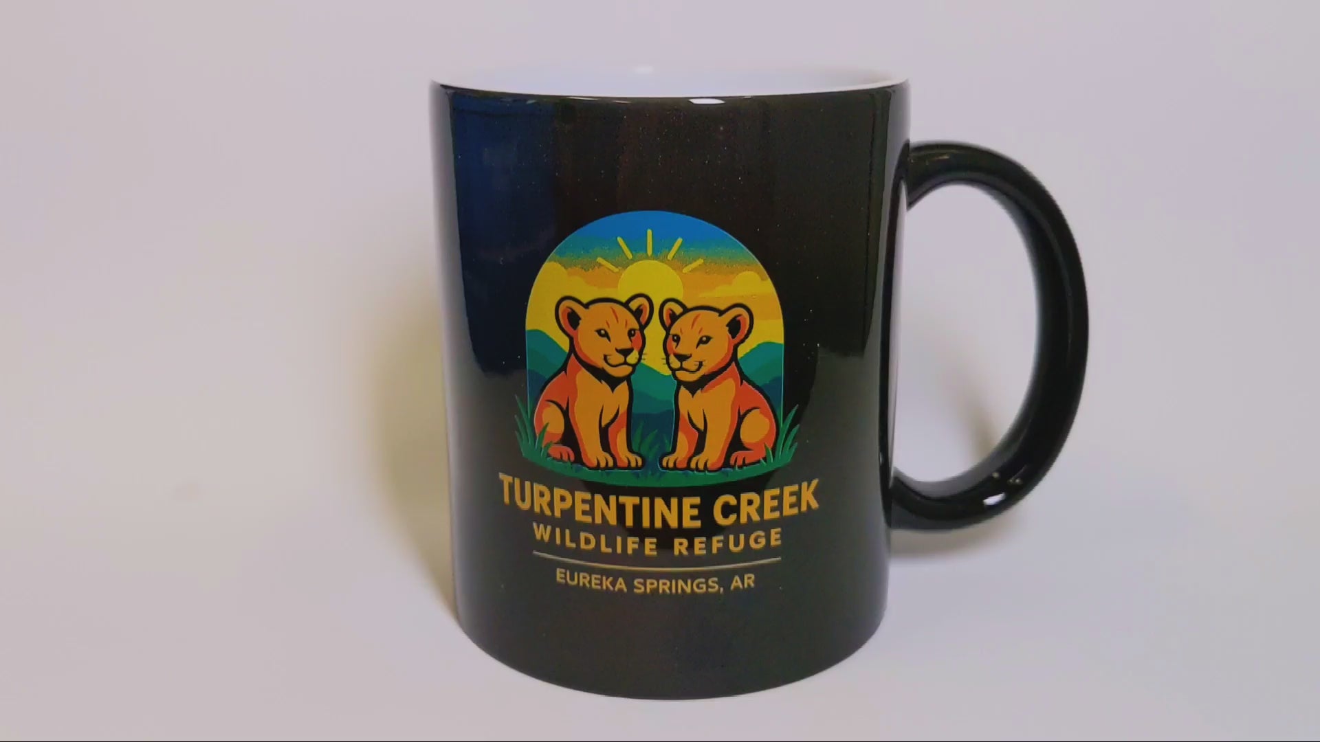 Watch the magic happen! This 12 oz features a bold colorful design of 2 lion cubs on a solid black mug, but when you pour in your favorite hot beverage—a hidden image of our newest rescues Reggie & Archie is revealed. This mug is attractive and eye-catching on the shelf, but when used it brings a smile to everyone with it's unique surprise photo.