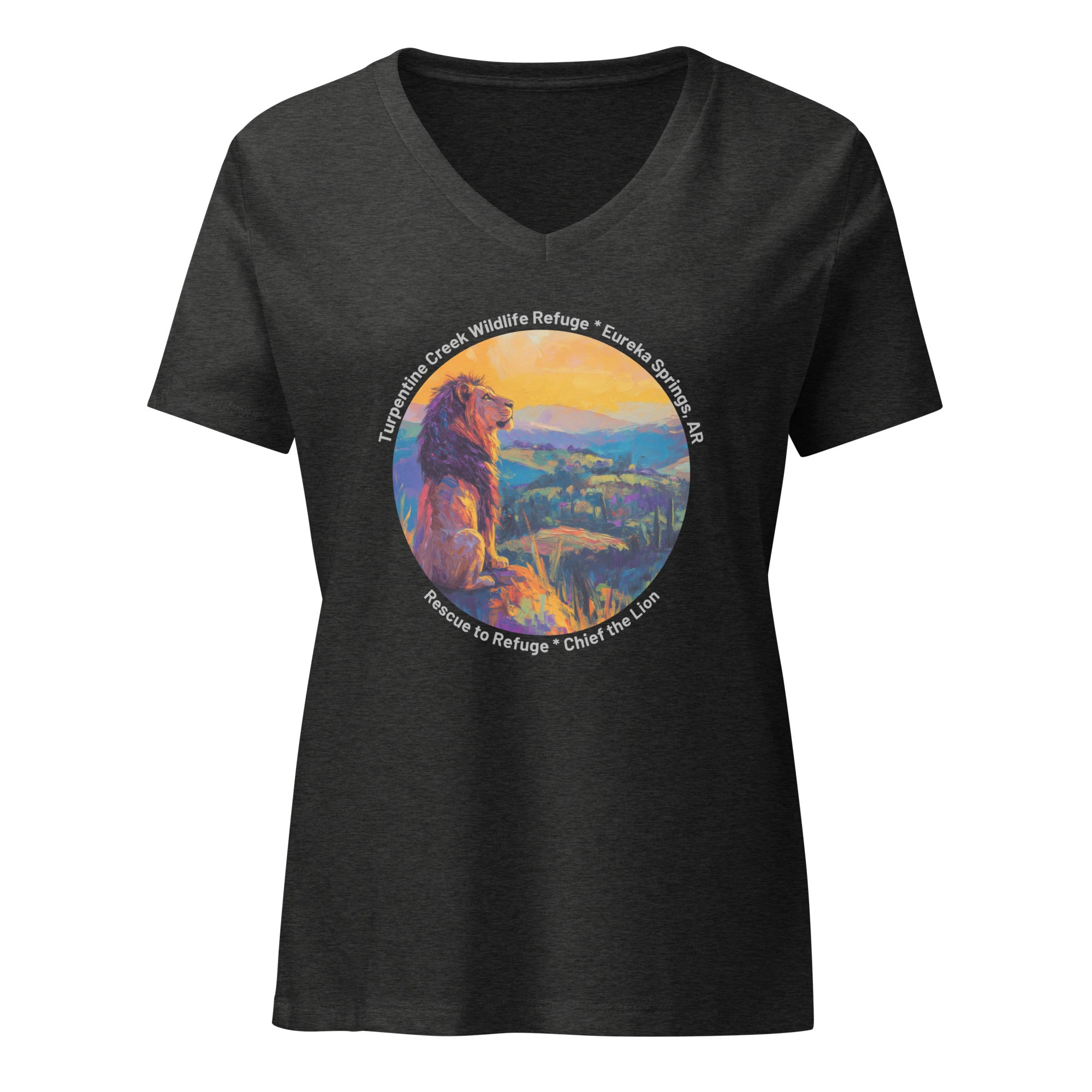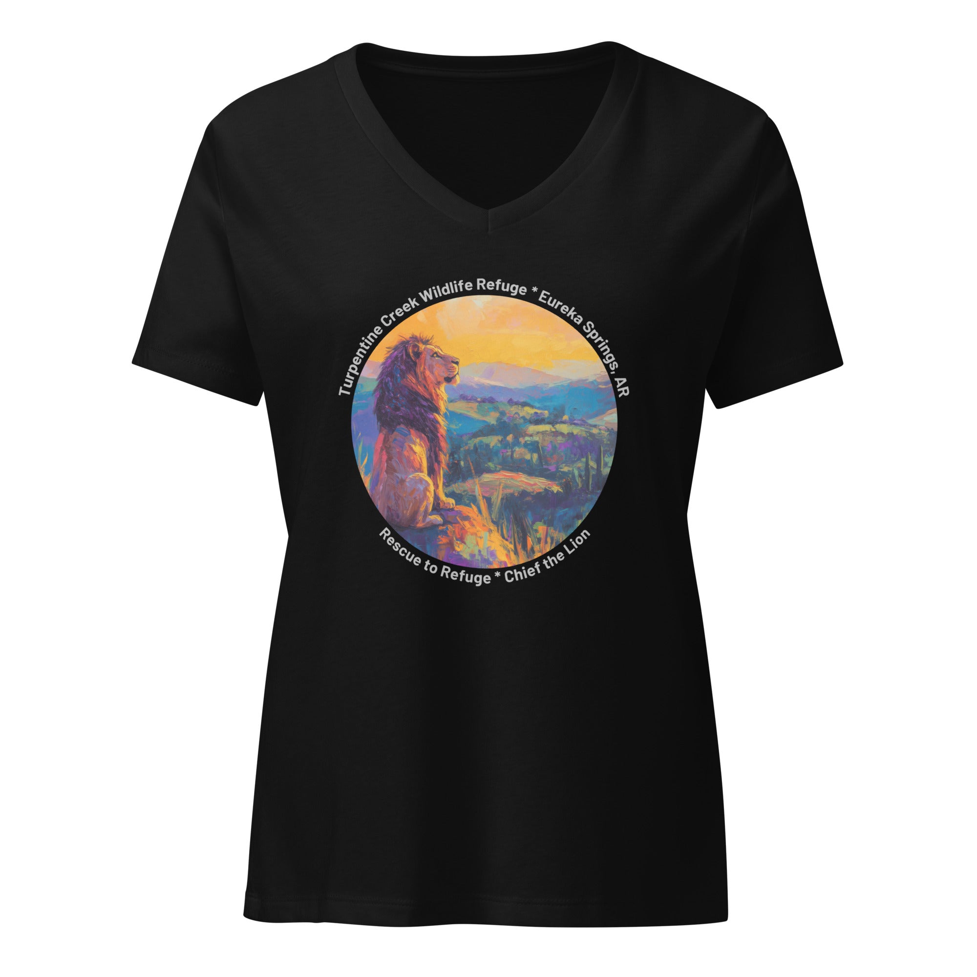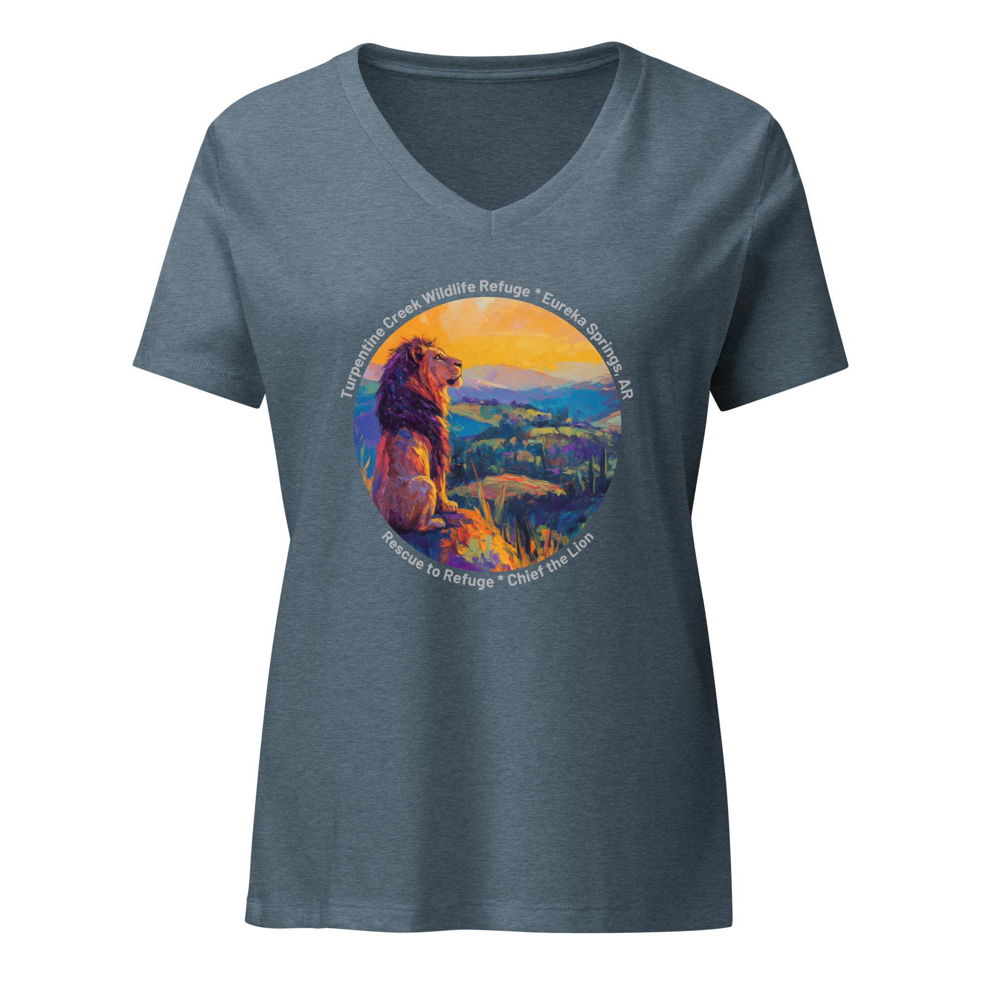Embrace ultimate comfort with this women’s v-neck t-shirt. Its soft poly/cotton blend fabric, relaxed fit and exclusive Chief Lion watercolor design make it ideal for a polished, fun everyday look, with the V-neck adding a touch of style.